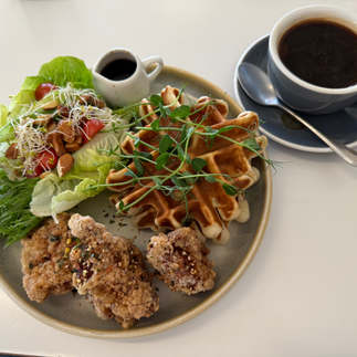 Visually, it’s a crowd-pleaser. A golden waffle, a tower of fried chicken, a handful of nuts scattered with intent, and a side of fresh greens to balance it all out. It arrives warm, fragrant, and Instagram-ready — the quintessential café brunch dish that promises indulgence without apology.